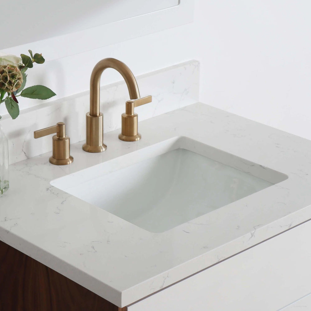 Each vanity is paired with a solid 3 cm slab of durable quartz,