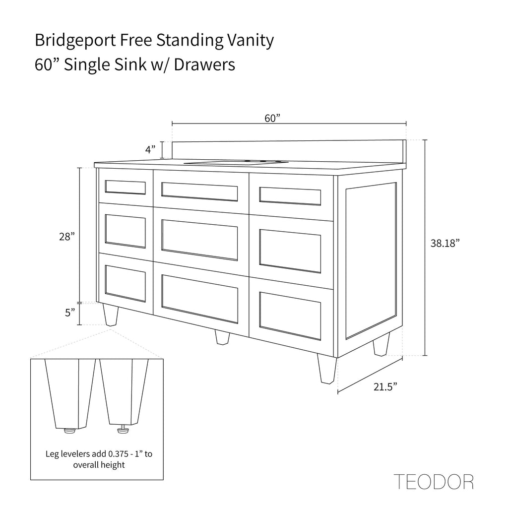 Bridgeport 60" White Oak Bathroom Vanity - All Drawers from Canadian made Teodor® vanities. Transitional full white oak shaker fronts and sides and tapered solid white oak legs. These well made vanities feature solid wood and wood veneer over plywood construction. Top of the line hardware and soft closing, full extension drawer sliders. Intricate dovetail drawer box design, and a wide selection of beautiful finishes and stone tops.