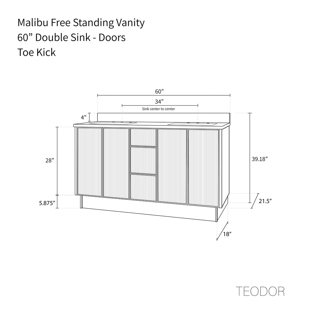 Malibu 60" American Black Walnut Bathroom Vanity, Double Sink from Canadian made Teodor® vanities. Full walnut reeded fronts and tapered solid walnut legs. These well made vanities feature solid wood and wood veneer over plywood construction. Top of the line hardware and soft closing, full extension drawer sliders as well as BLUM® 110° full overlay hinges. Intricate dovetail drawer box design, and a wide selection of beautiful finishes and stone tops.