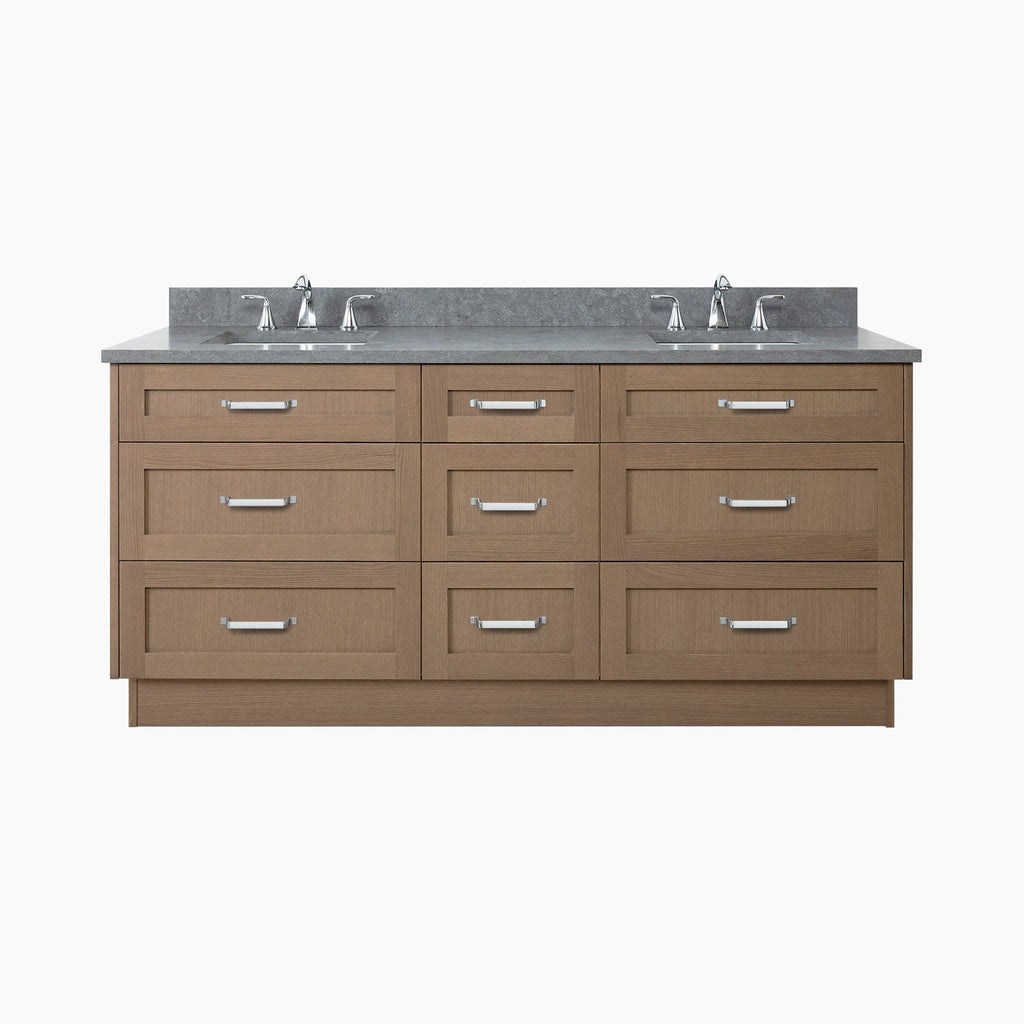 Bridgeport 72" Almond Coast Bathroom Vanity, Double Sink - All Drawers from Canadian made Teodor® vanities. Transitional full oak shaker fronts and sides and tapered solid oak legs. These well made vanities feature solid wood and wood veneer over plywood construction. Top of the line hardware and soft closing, full extension drawer sliders. Intricate dovetail drawer box design, and a wide selection of beautiful finishes and stone tops.