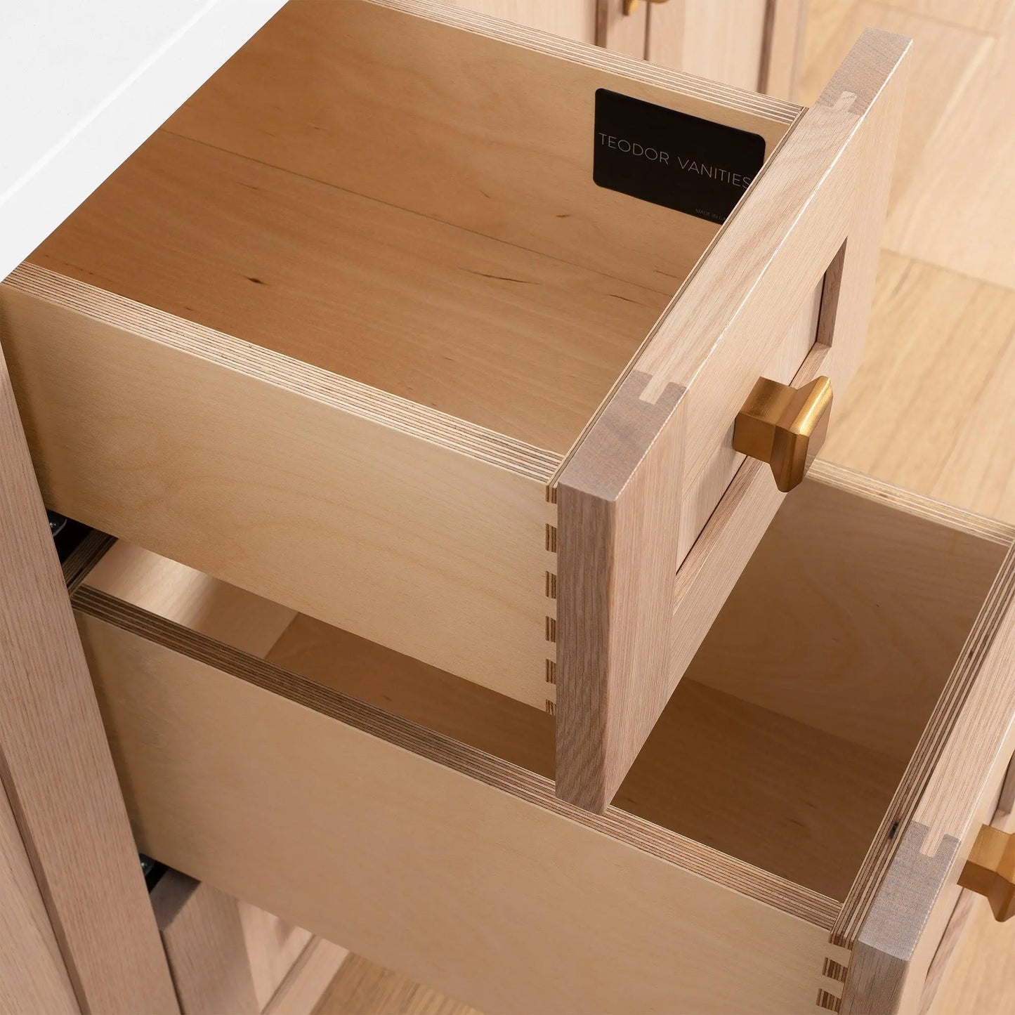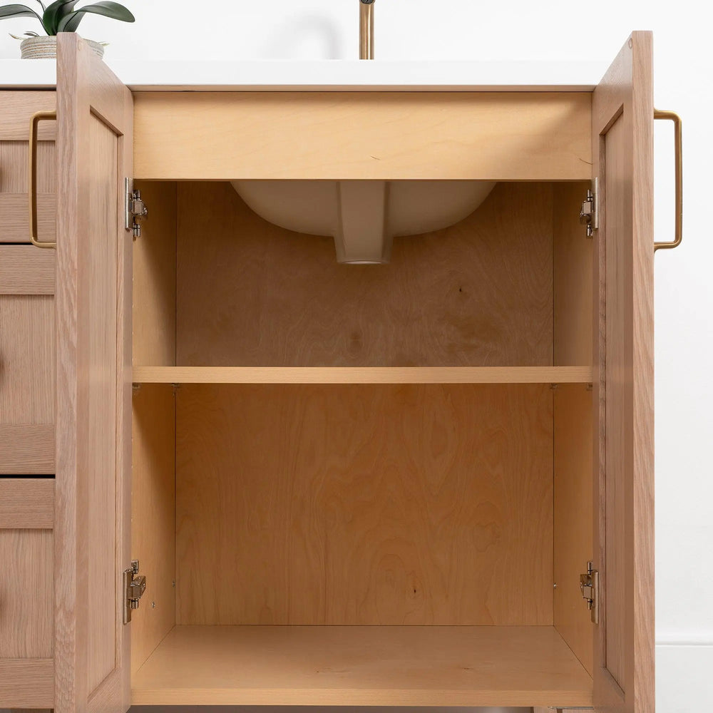 Transitional beauty enters your bath space with a subtle whitewash over white oak shaker front and sides, and tapered solid white oak legs. These well made vanities feature solid wood and wood veneer over plywood construction. Top of the line hardware and soft closing, full extension drawer sliders as well as BLUM® 110° full overlay hinges. Intricate dovetail drawer box design, and a wide selection of beautiful finishes and stone tops.