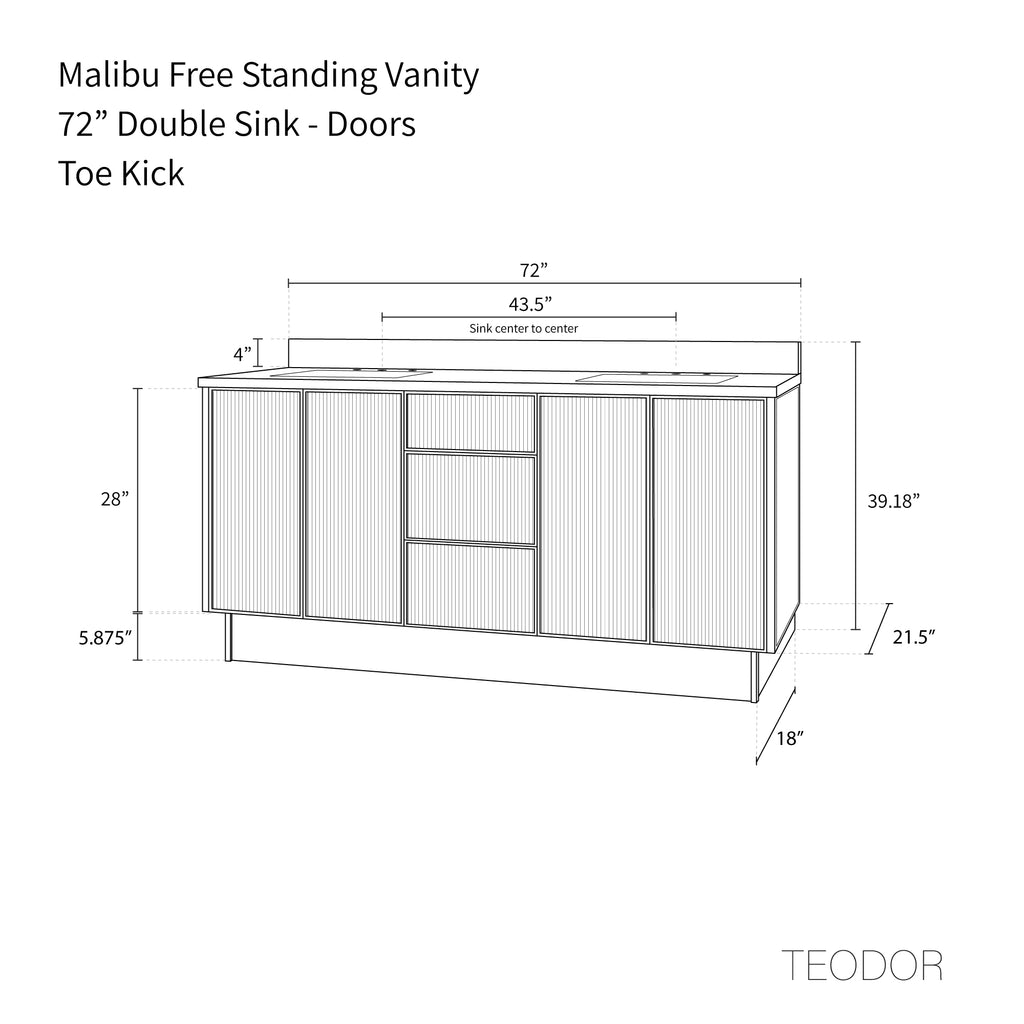Malibu 72" American Black Walnut Bathroom Vanity, Double Sink from Canadian made Teodor® vanities. Full walnut reeded fronts and tapered solid walnut legs. These well made vanities feature solid wood and wood veneer over plywood construction. Top of the line hardware and soft closing, full extension drawer sliders as well as BLUM® 110° full overlay hinges. Intricate dovetail drawer box design, and a wide selection of beautiful finishes and stone tops.