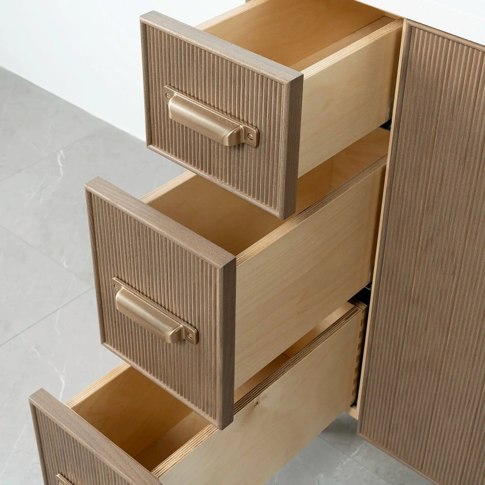 Malibu 36" Almond Coast Bathroom Vanity, Right Sink from Canadian made Teodor® vanities. Full oak reeded fronts and tapered solid oak legs. These well made vanities feature solid wood and wood veneer over plywood construction. Top of the line hardware and soft closing, full extension drawer sliders as well as BLUM® 110° full overlay hinges. Intricate dovetail drawer box design, and a wide selection of beautiful finishes and stone tops.