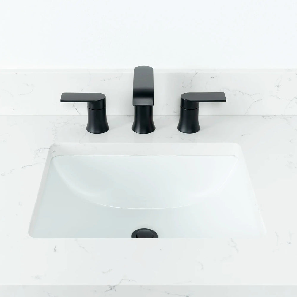 Each vanity is paired with a solid 3 cm slab of durable quartz,