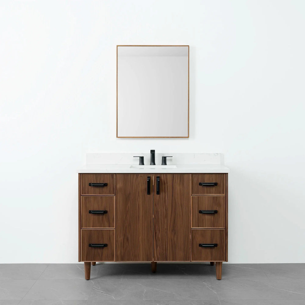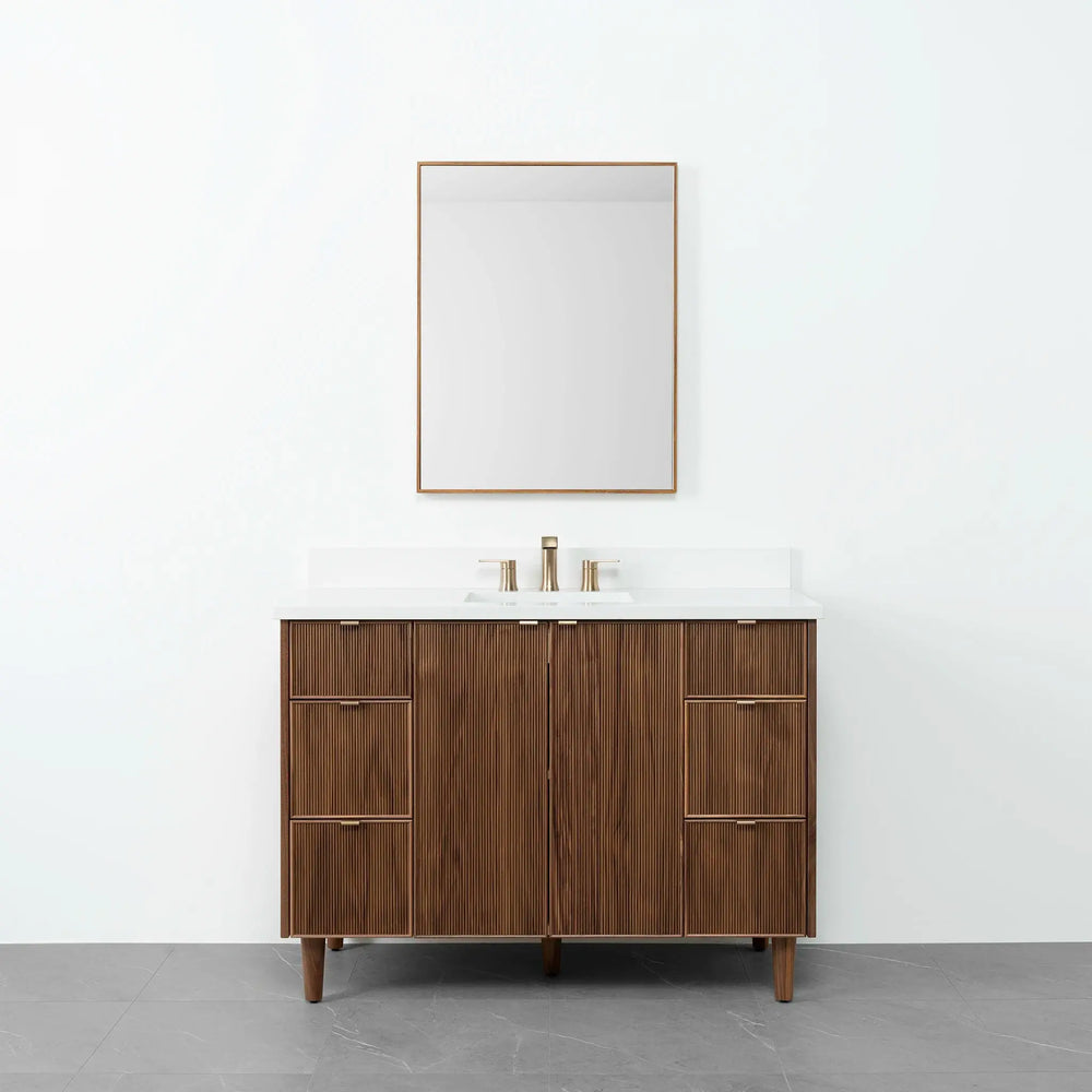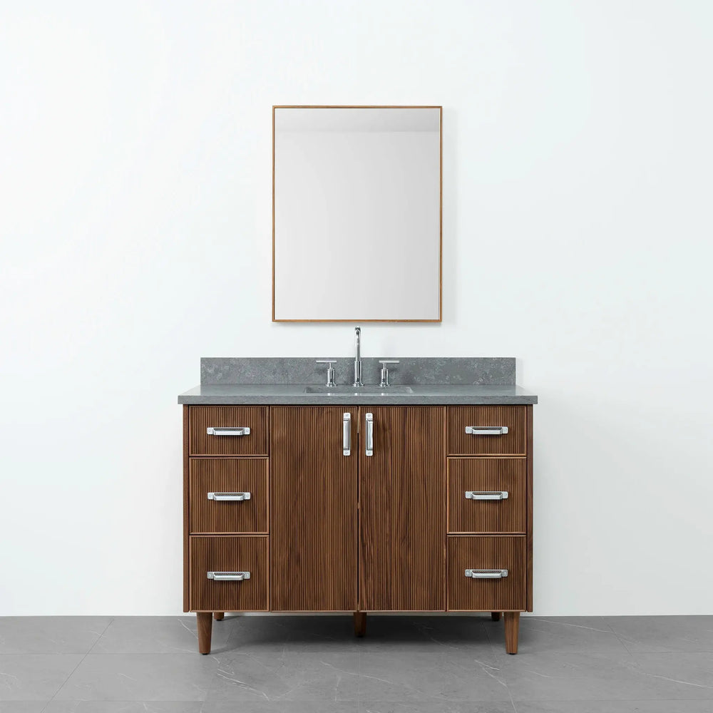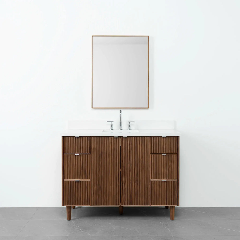 Malibu 48" American Black Walnut Bathroom Vanity from Canadian made Teodor® vanities. Full walnut reeded fronts and tapered solid walnut legs. These well made vanities feature solid wood and wood veneer over plywood construction. Top of the line hardware and soft closing, full extension drawer sliders as well as BLUM® 110° full overlay hinges. Intricate dovetail drawer box design, and a wide selection of beautiful finishes and stone tops.