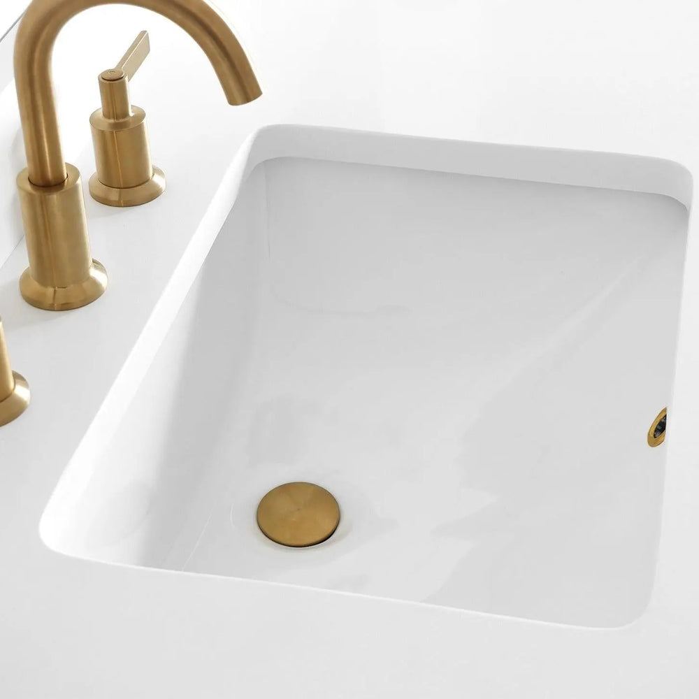 Each vanity is paired with a solid 3 cm slab of durable quartz,