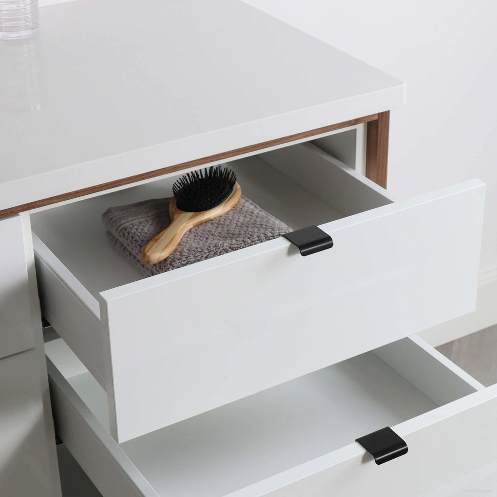 A closer look at the sophisticated design elements of the Sidney Gloss White Vanity.
