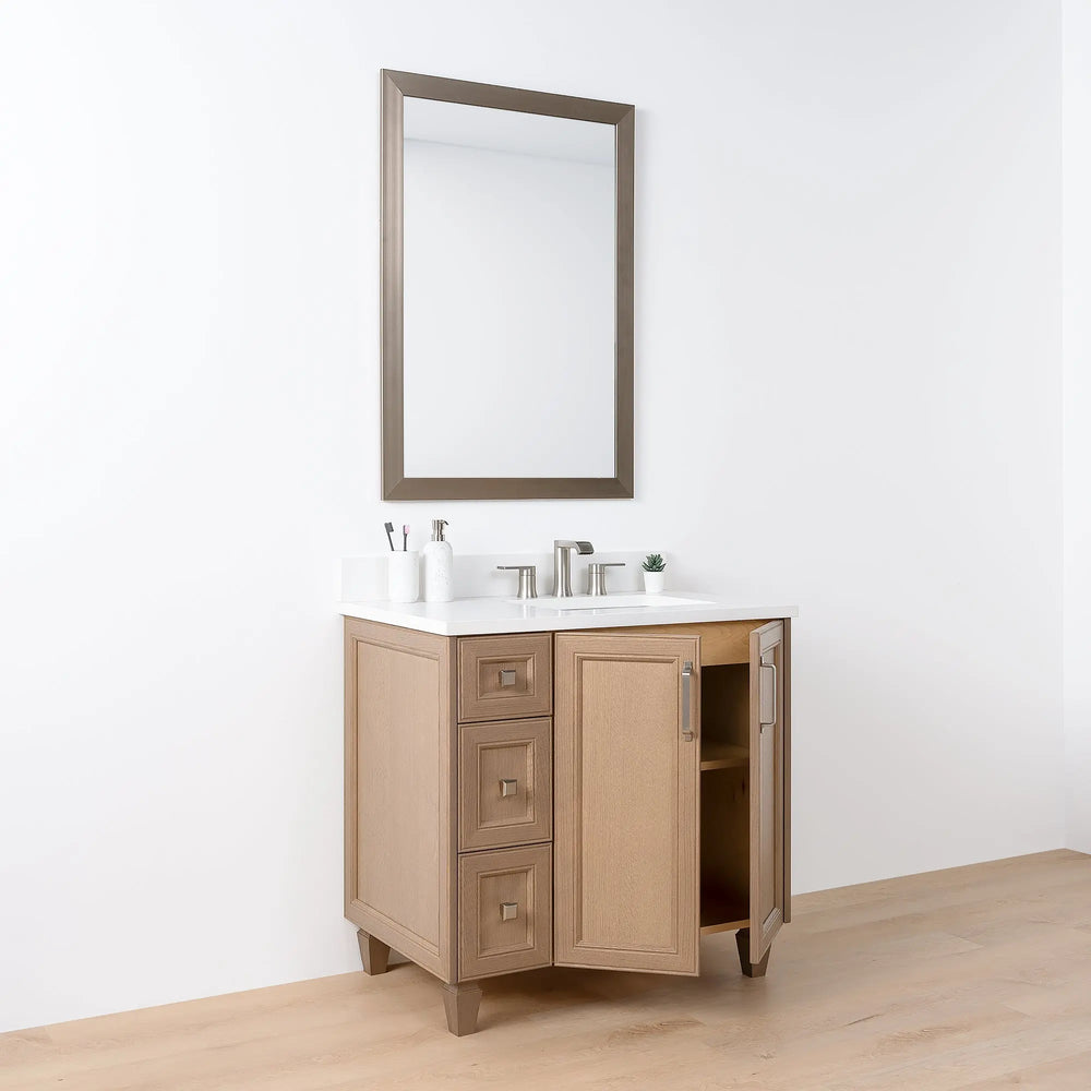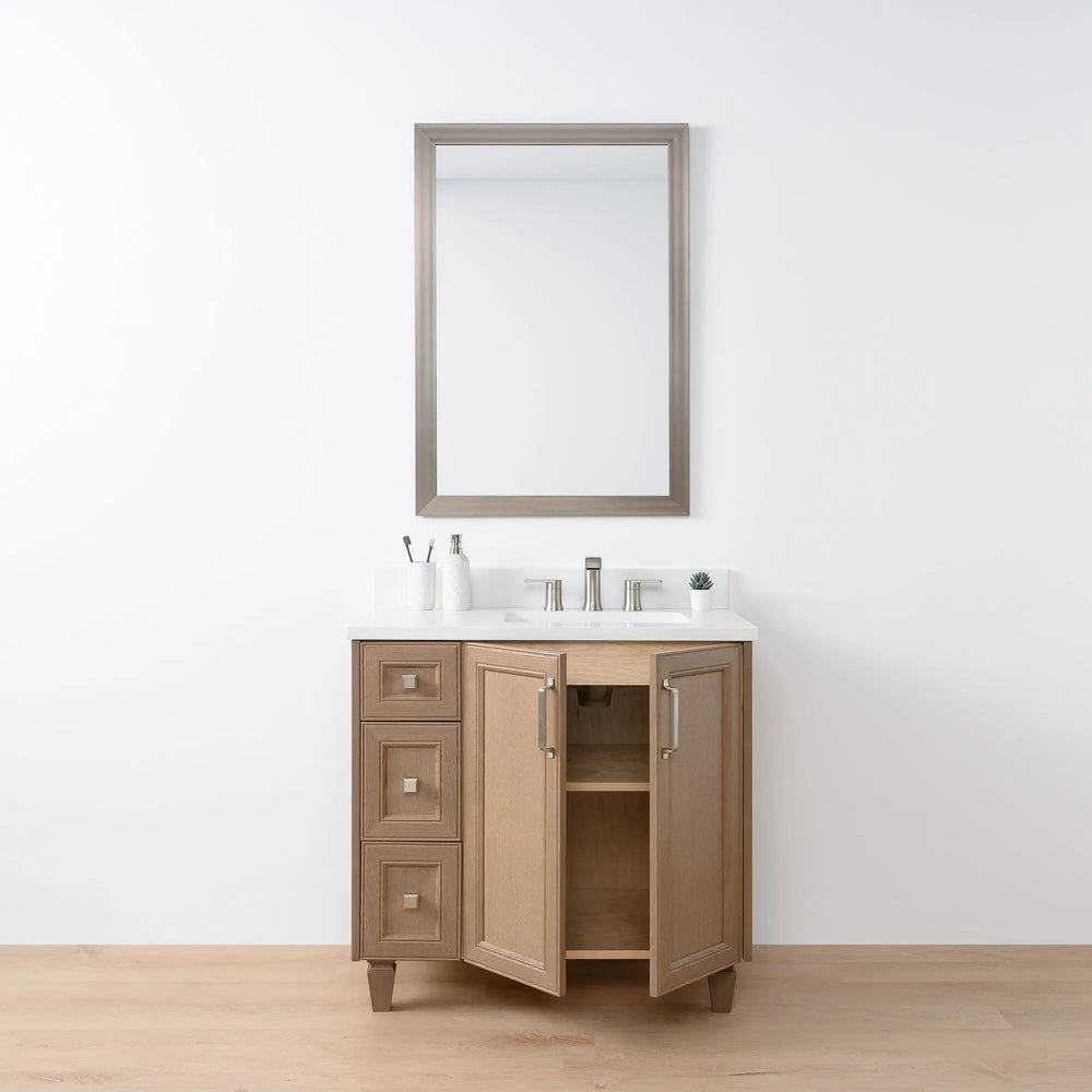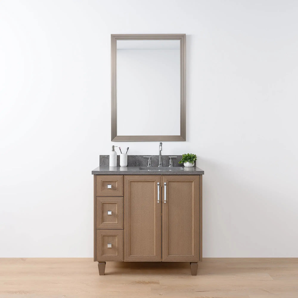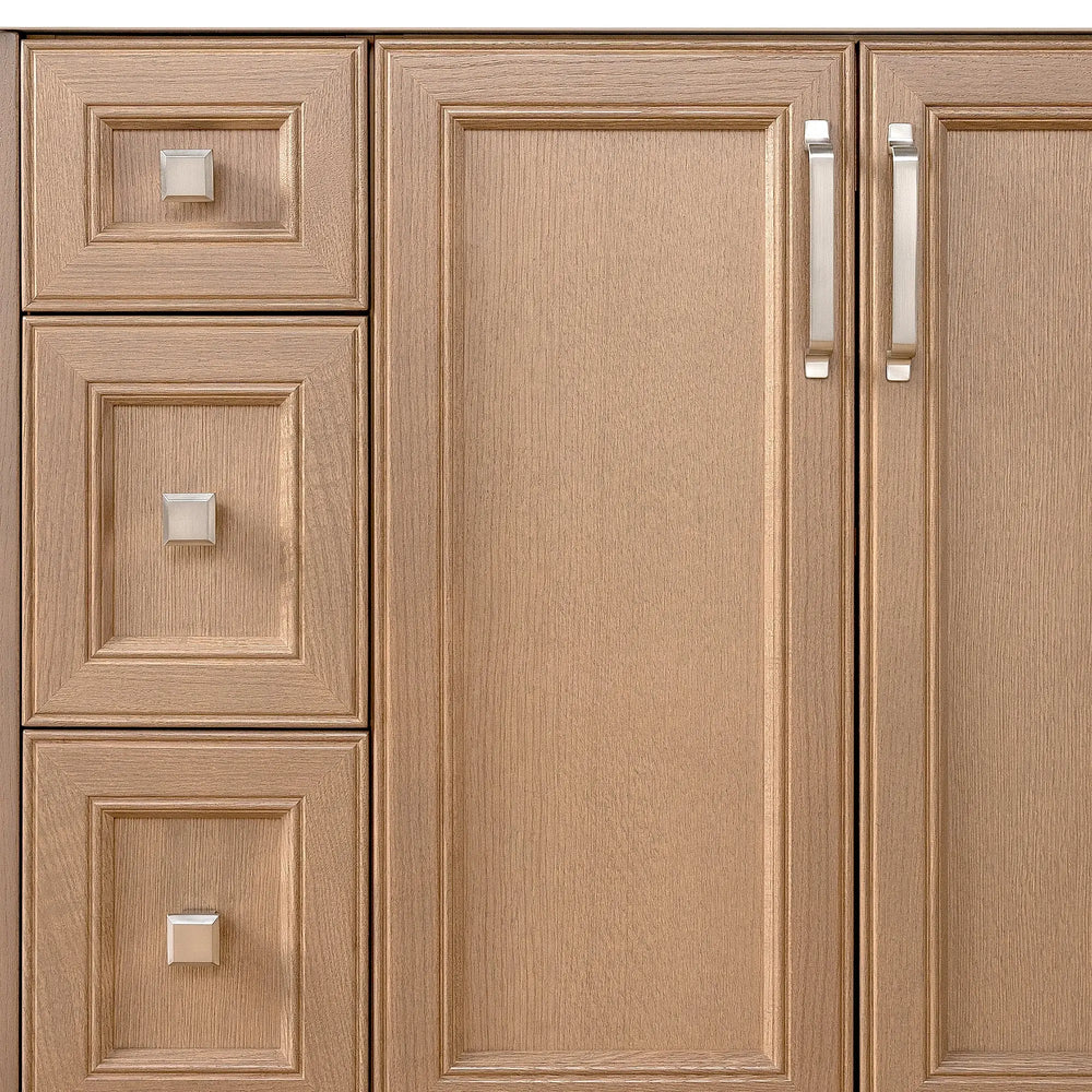 Davenport 36" Almond Coast Bathroom Vanity, Right Sink from Canadian made Teodor® vanities. Full oak mitered fronts and sides with tapered solid oak legs. These well made vanities feature solid wood and wood veneer over plywood construction. Top of the line hardware and soft closing, full extension drawer sliders as well as BLUM® 110° full overlay hinges. Intricate dovetail drawer box design, and a wide selection of beautiful finishes and stone tops.