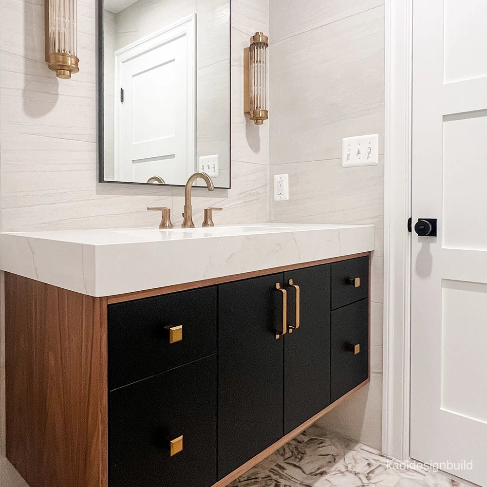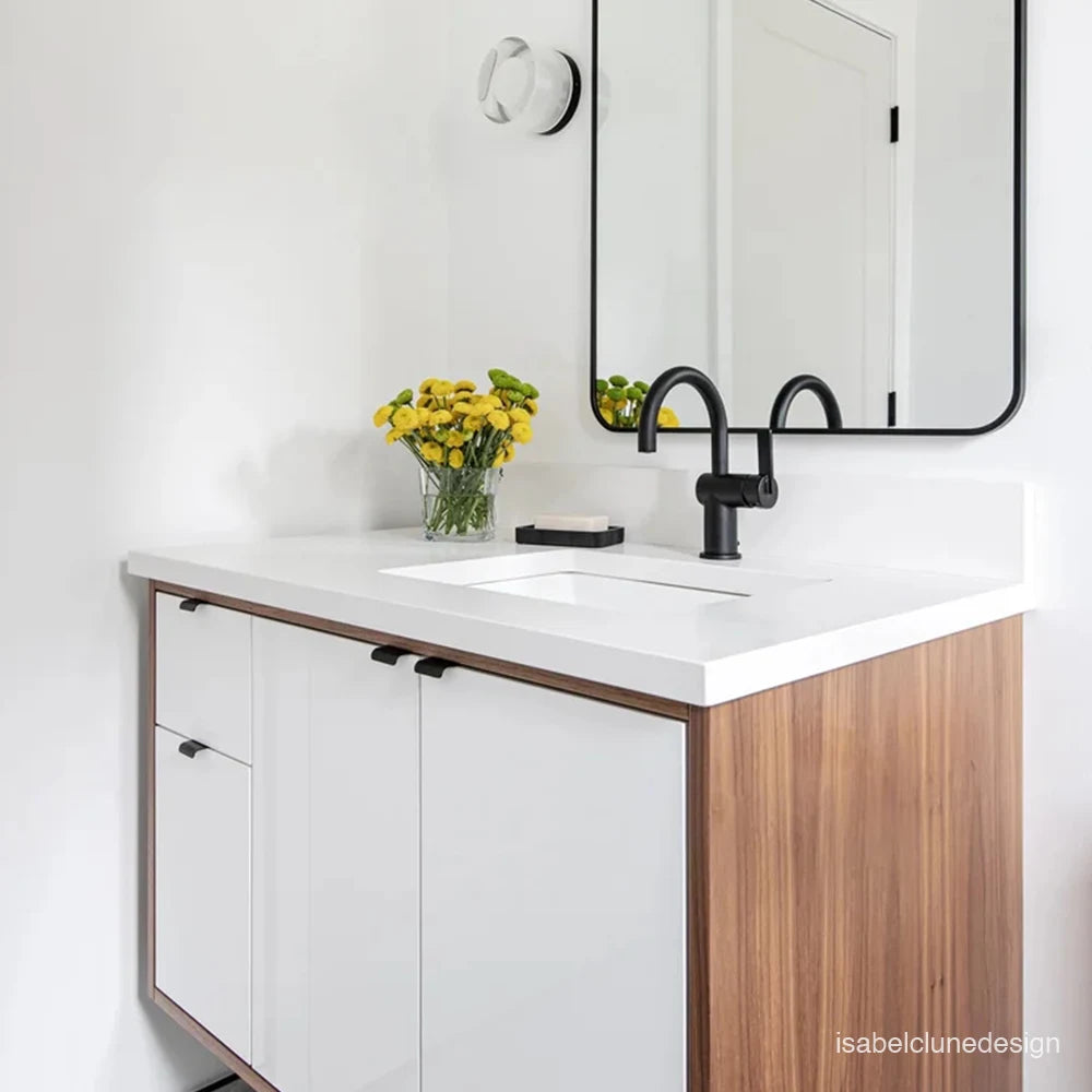 Each vanity is paired with a solid 3 cm slab of durable quartz,
