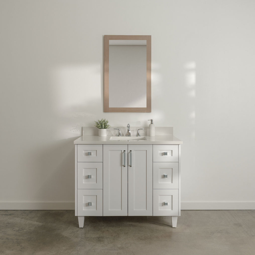 Bridgeport SLIM 42" Satin White Bathroom Vanity from Canadian made Teodor® vanities. Transitional beauty enters your bath space with full maple shaker fronts and sides and tapered solid maple legs. These well made vanities feature solid wood and wood veneer over plywood construction. Top of the line hardware and soft closing, full extension drawer sliders as well as BLUM® 110° full overlay hinges. Intricate dovetail drawer box design, and a wide selection of beautiful finishes and stone tops.