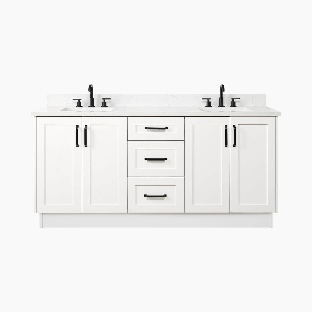 Each vanity is paired with a solid 3 cm slab of durable quartz,
