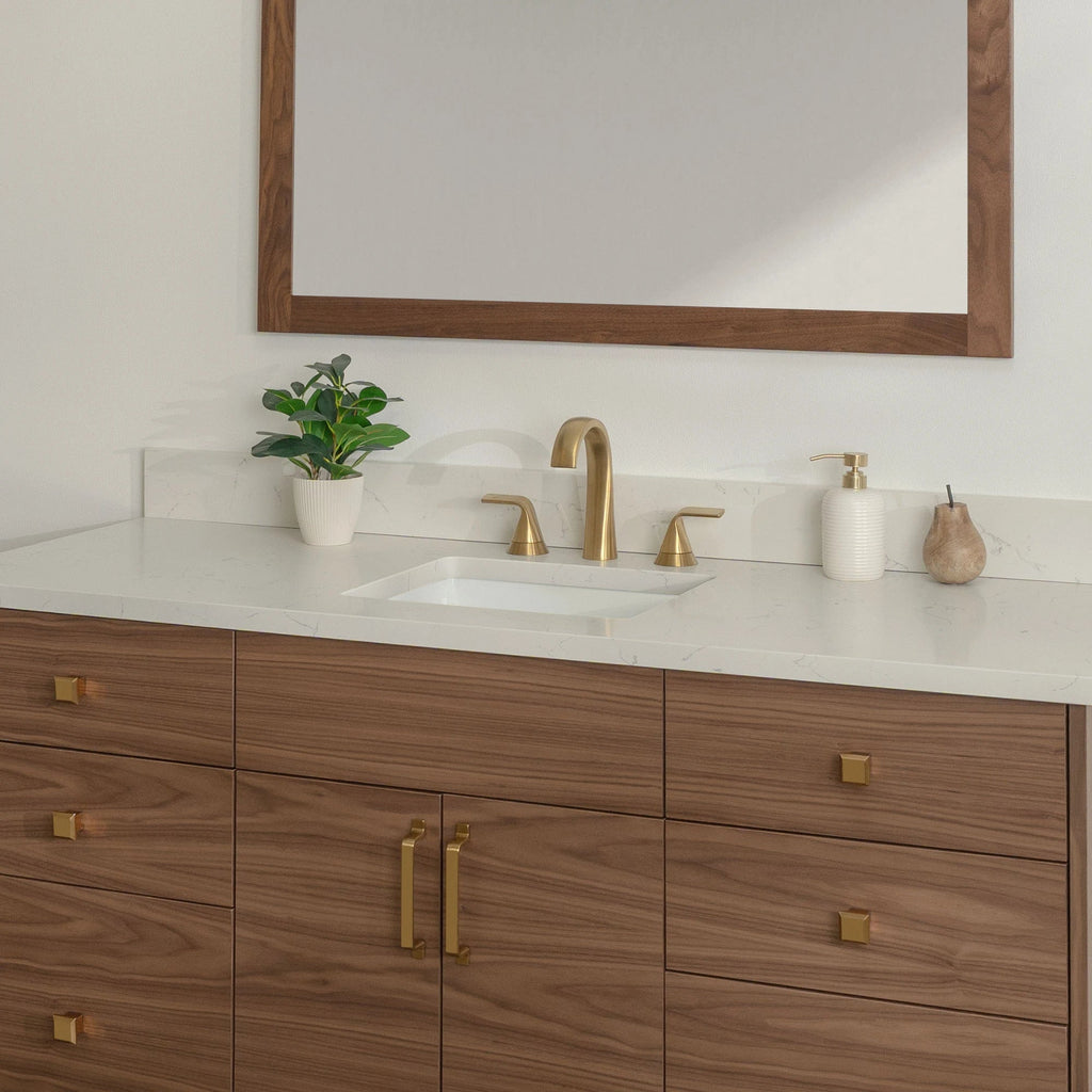 Each vanity is paired with a solid 3 cm slab of durable quartz,