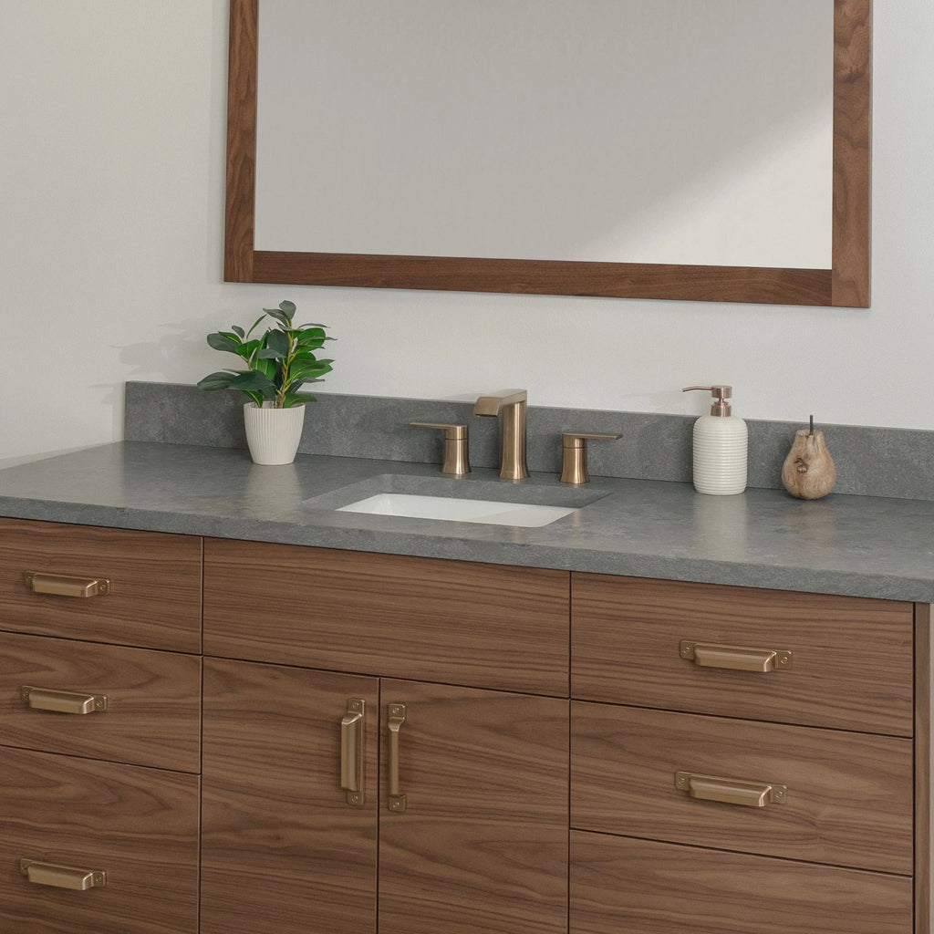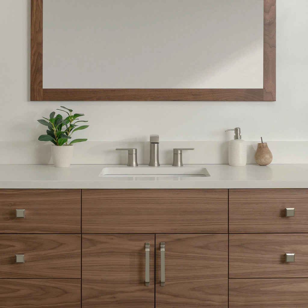 A closer look at the sophisticated design elements of the Austin Stainless American Black Walnut Vanity.