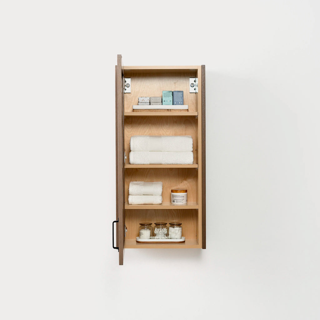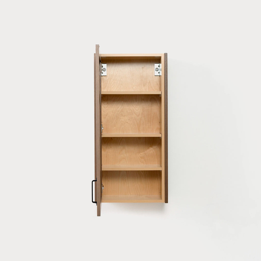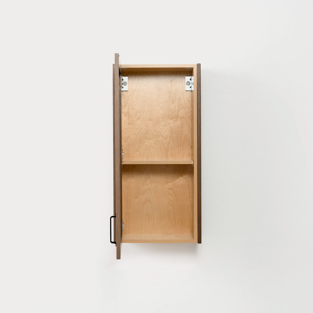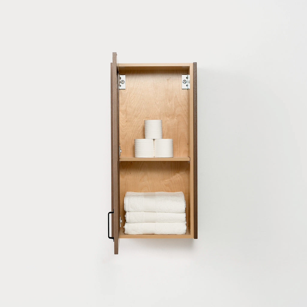 The Bridgeport Wall Cabinet offers the ideal storage solution with its sturdy solid wood and plywood backed wood veneer construction. Its wall-mounted design is both space-saving and aesthetically pleasing, allowing you to create an organized, modern look without sacrificing floor space. Perfect for mounting above the toilet to create usable storage space. Featuring solid wood and wood veneer over plywood construction, as well as top of the line hardware and BLUM® 110° full overlay hinges.