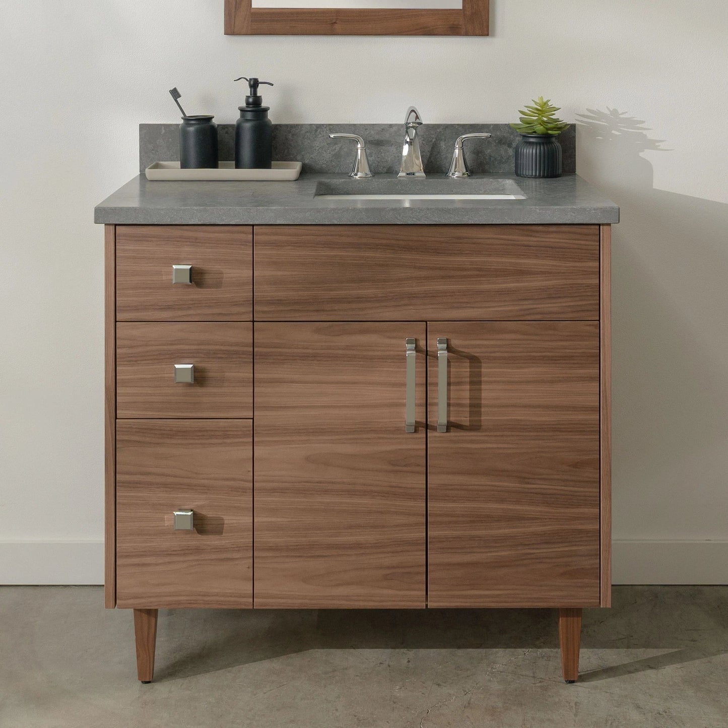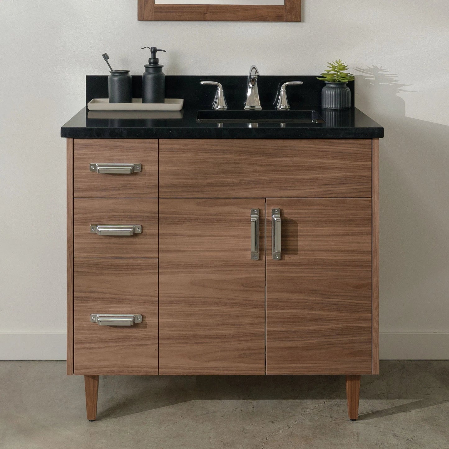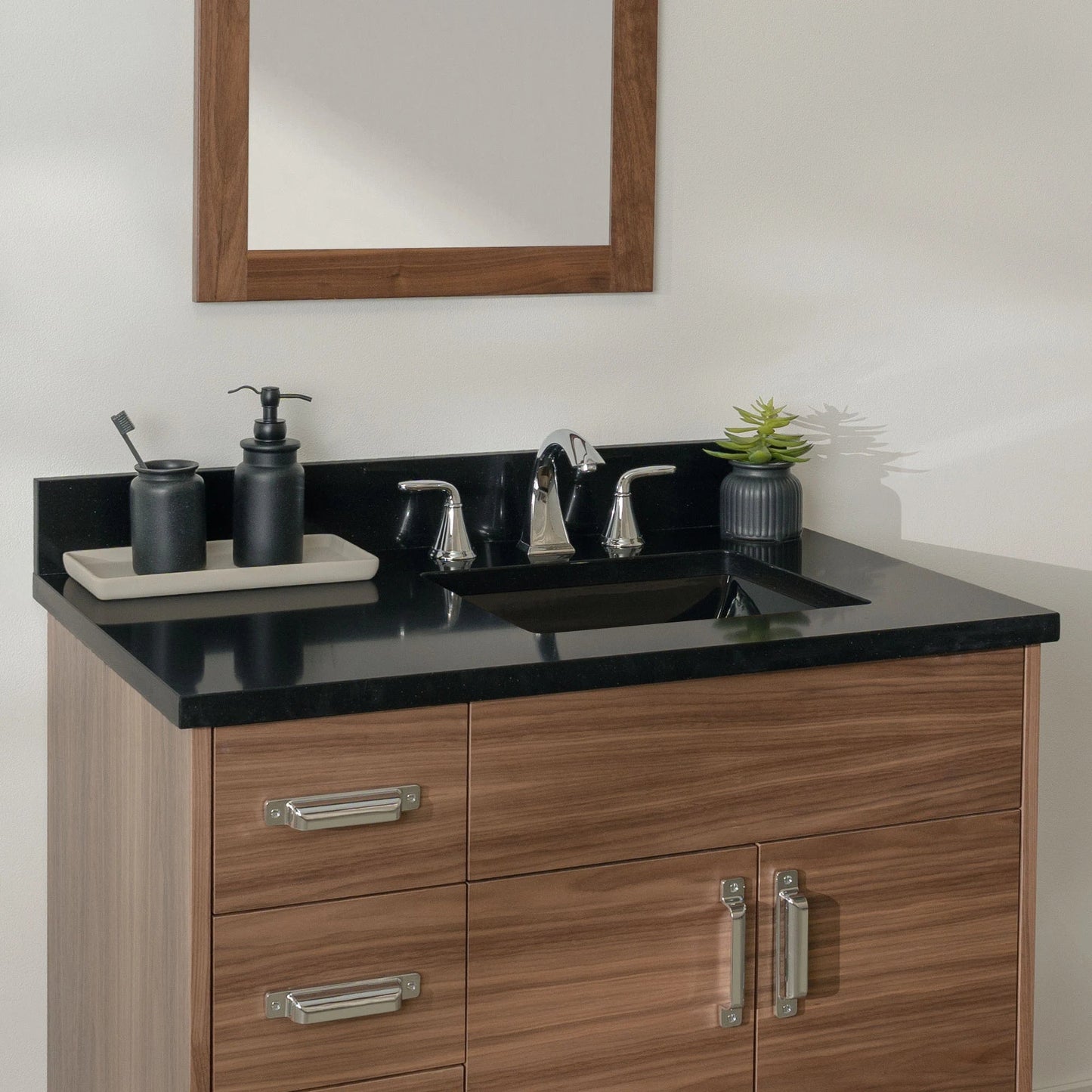 A closer look at the sophisticated design elements of the Austin Stainless American Black Walnut Vanity.