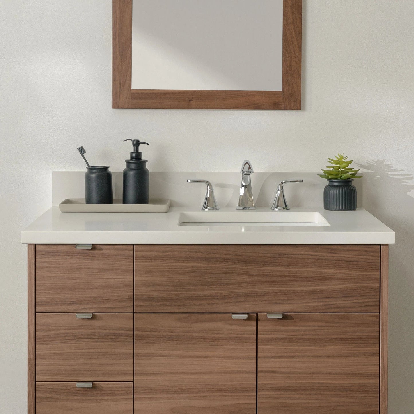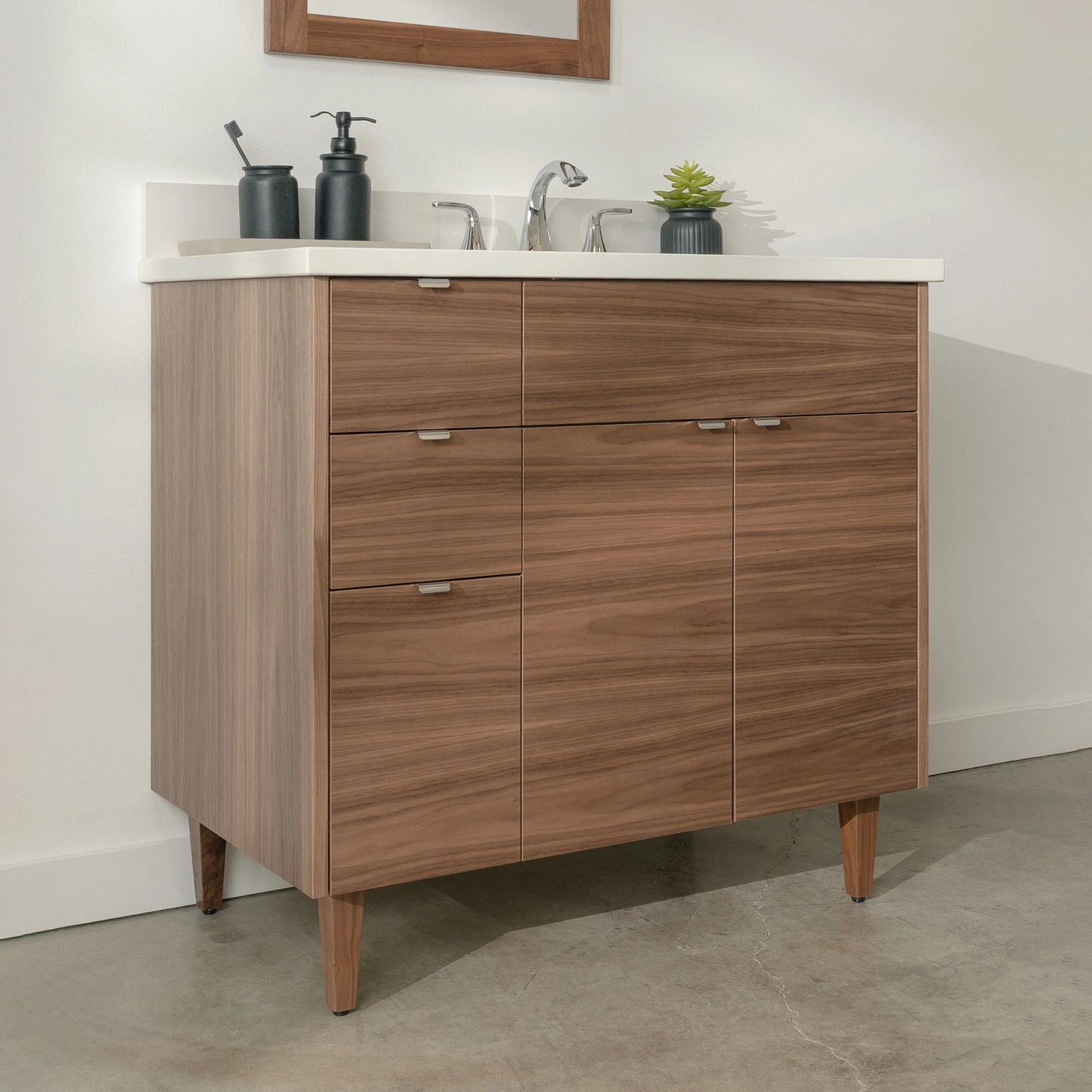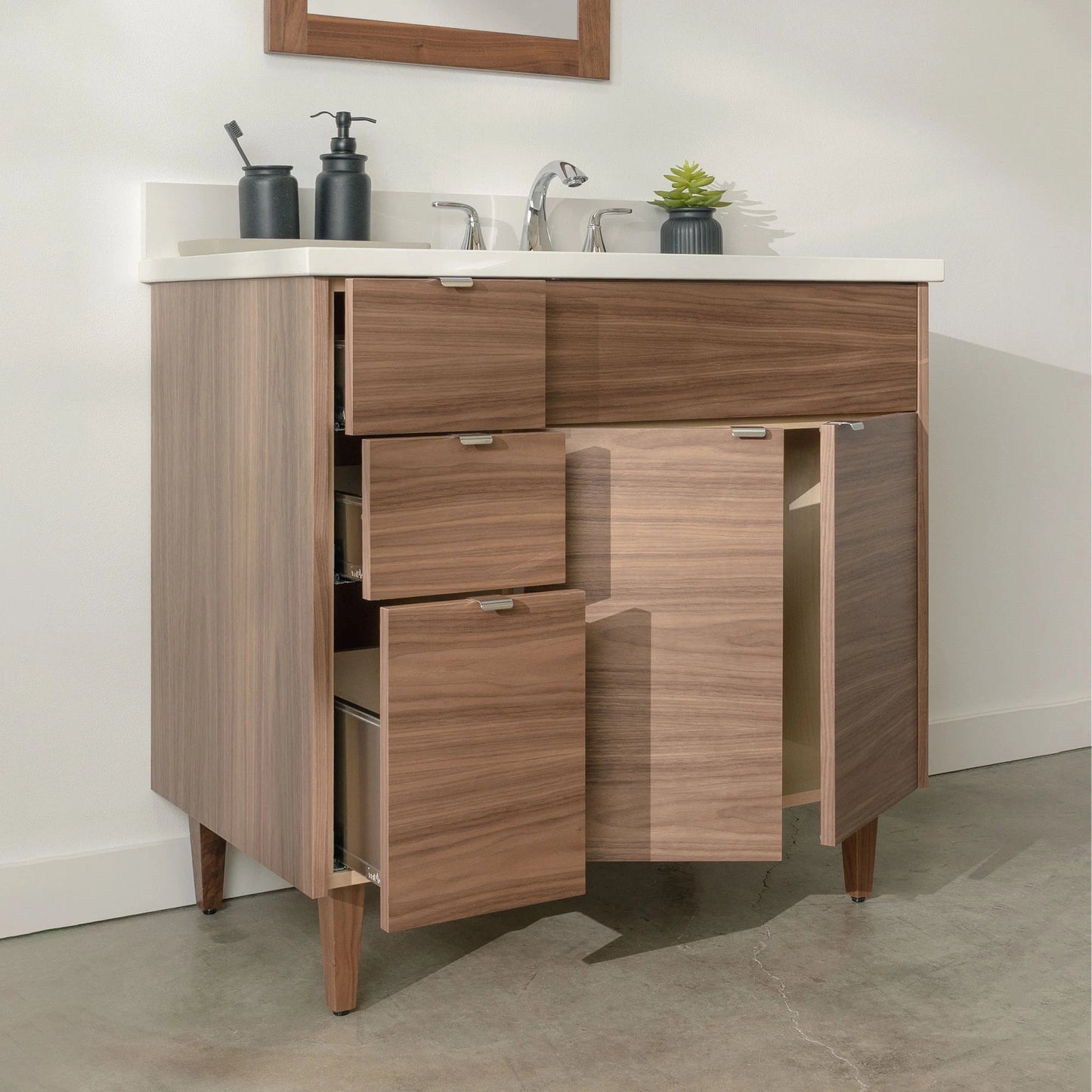 A closer look at the sophisticated design elements of the Austin Stainless American Black Walnut Vanity.