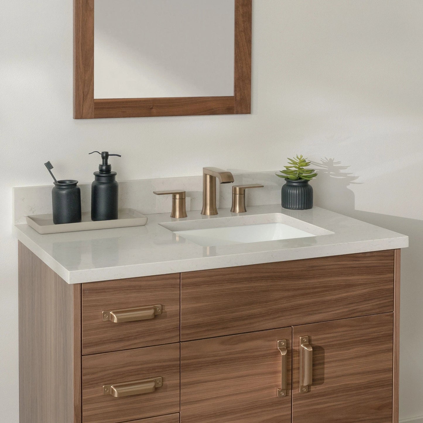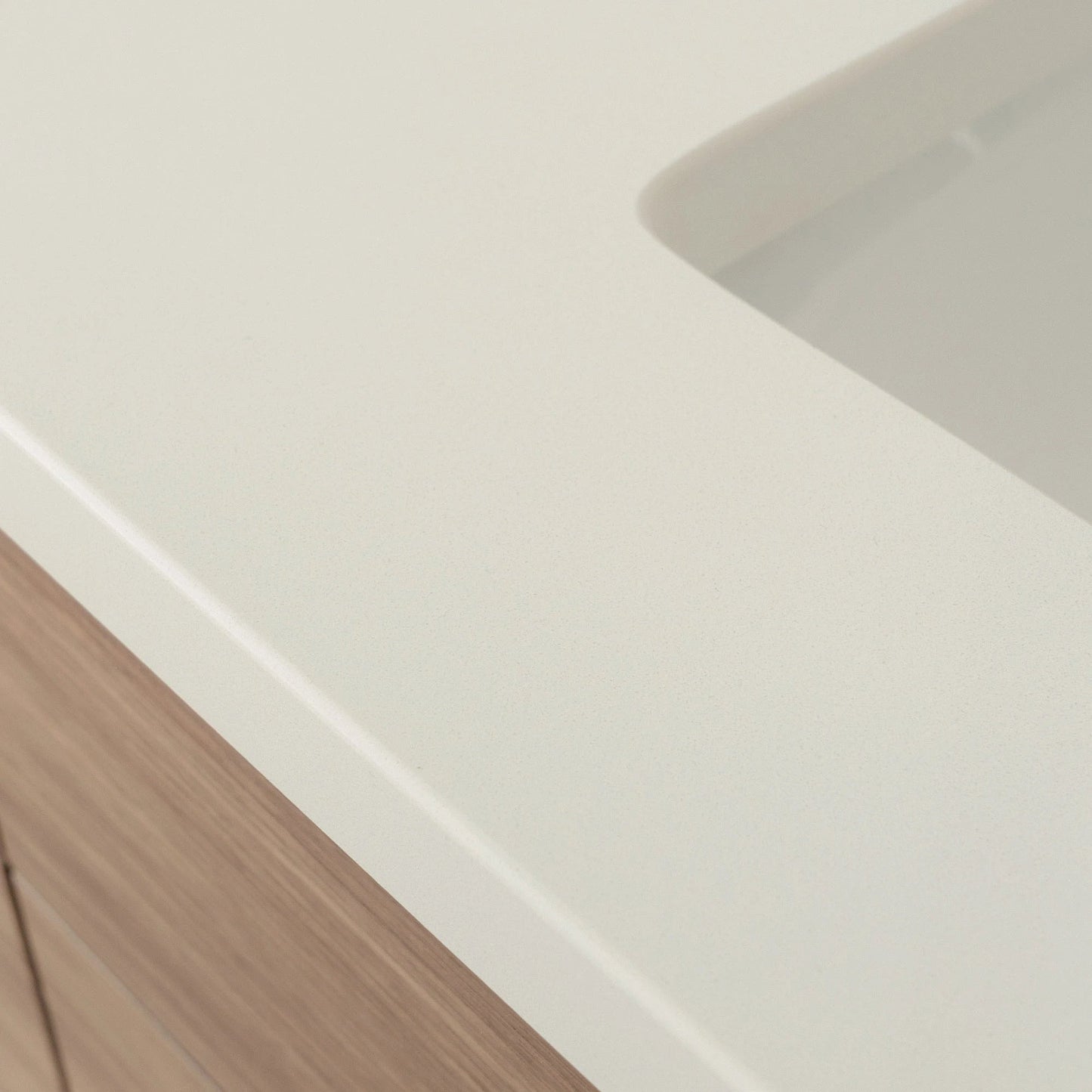 Each vanity is paired with a solid 3 cm slab of durable quartz,