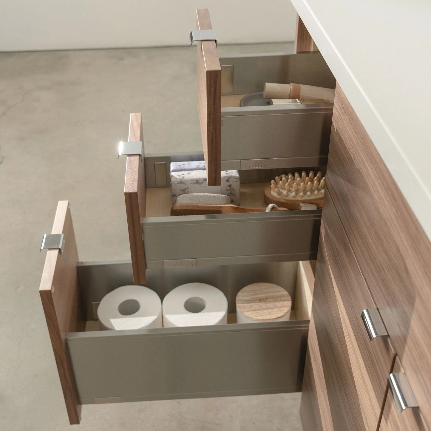 - BLUM® Legrabox Stainless Steel drawer box.