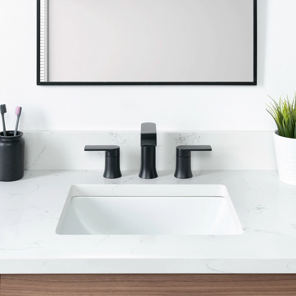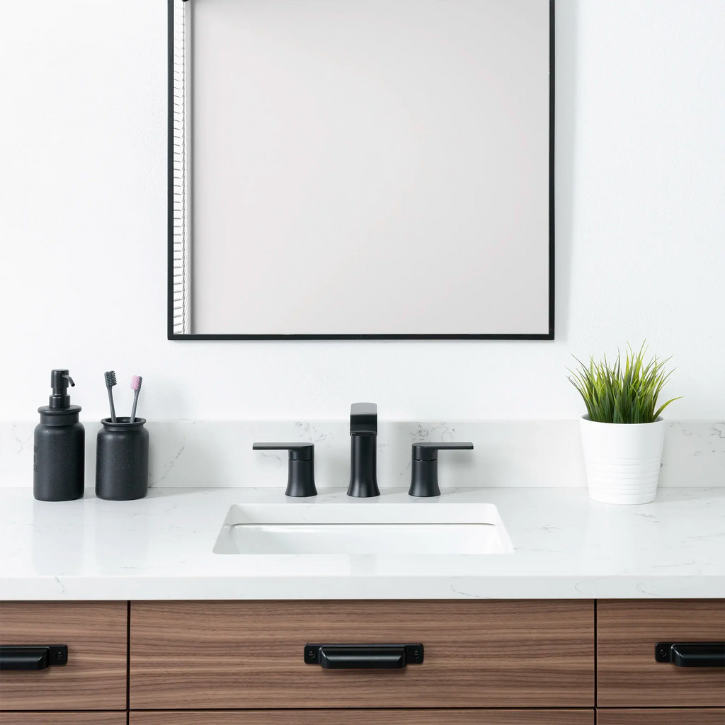 Each vanity is paired with a solid 3 cm slab of durable quartz,