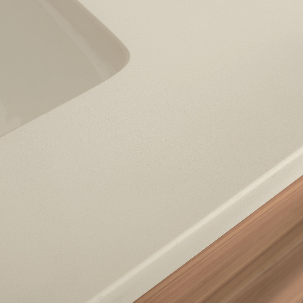 Each vanity is paired with a solid 3 cm slab of durable quartz,